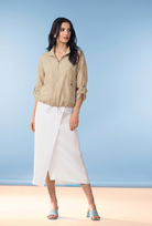 This effortless zip-front linen blend blouse captures the essence of easy, sun-drenched style. Crafted in a soft linen-viscose blend, the lightweight fabric drapes beautifully while offering breathable comfort for warm days. The relaxed silhouette features a classic collar, full-length zip closure, and practical patch pockets at the hips. Roll-tab sleeves allow for versatile styling, while the gathered elastic hem creates a gently bloused effect. Perfect for pairing with the coordinating cargo pants or your favourite summer separates.